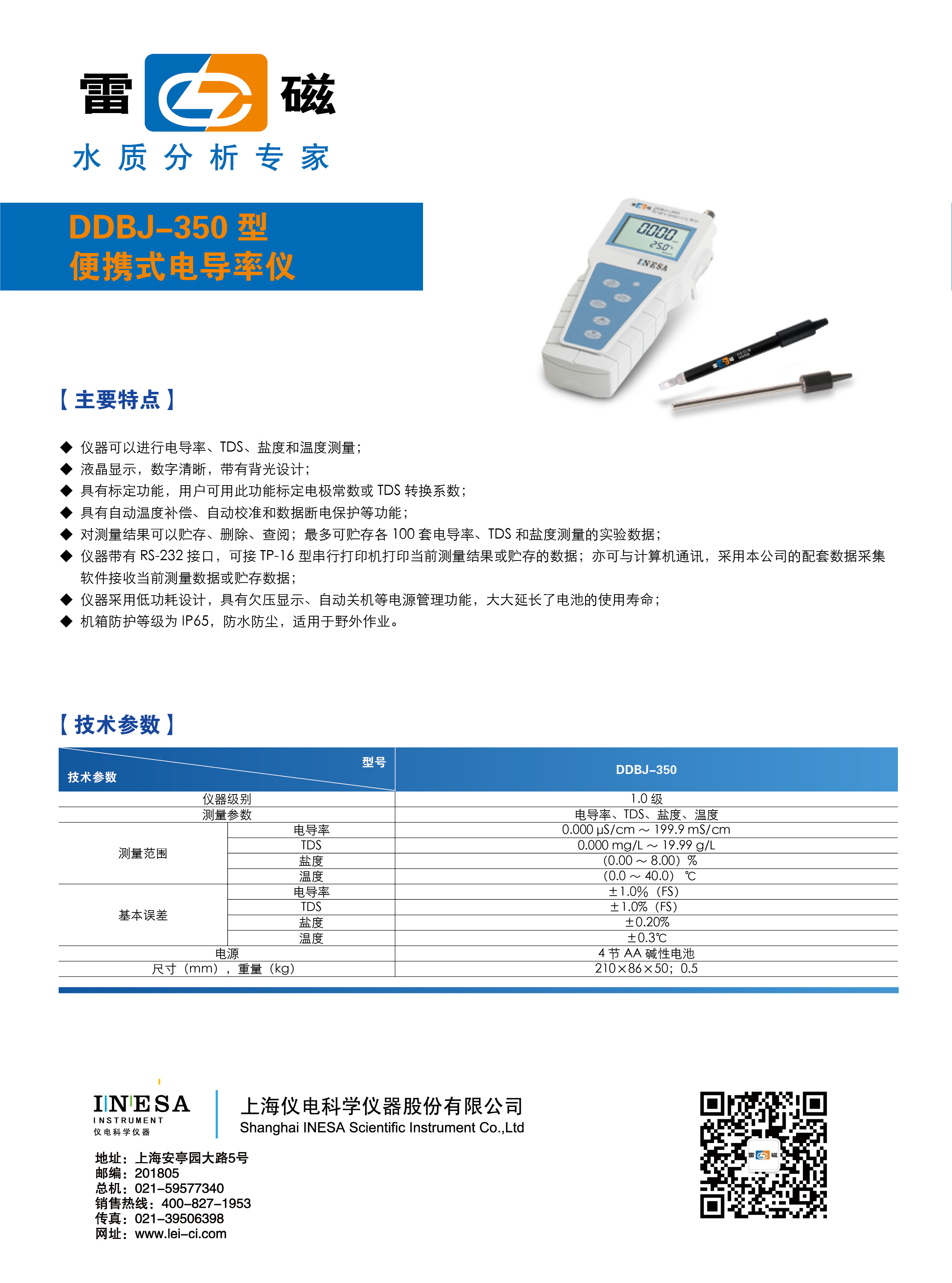 上海雷磁 便攜式電導(dǎo)率儀 DDBJ-350型